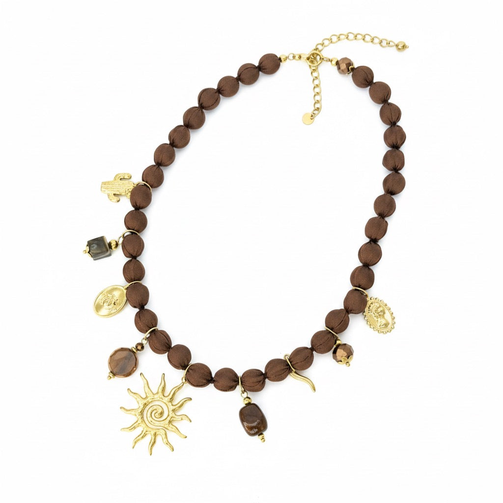 Collana composta da palline di tessuto e ciondoli in acciaio inossidabile. Lunghezza 40 cm oltre estensione.