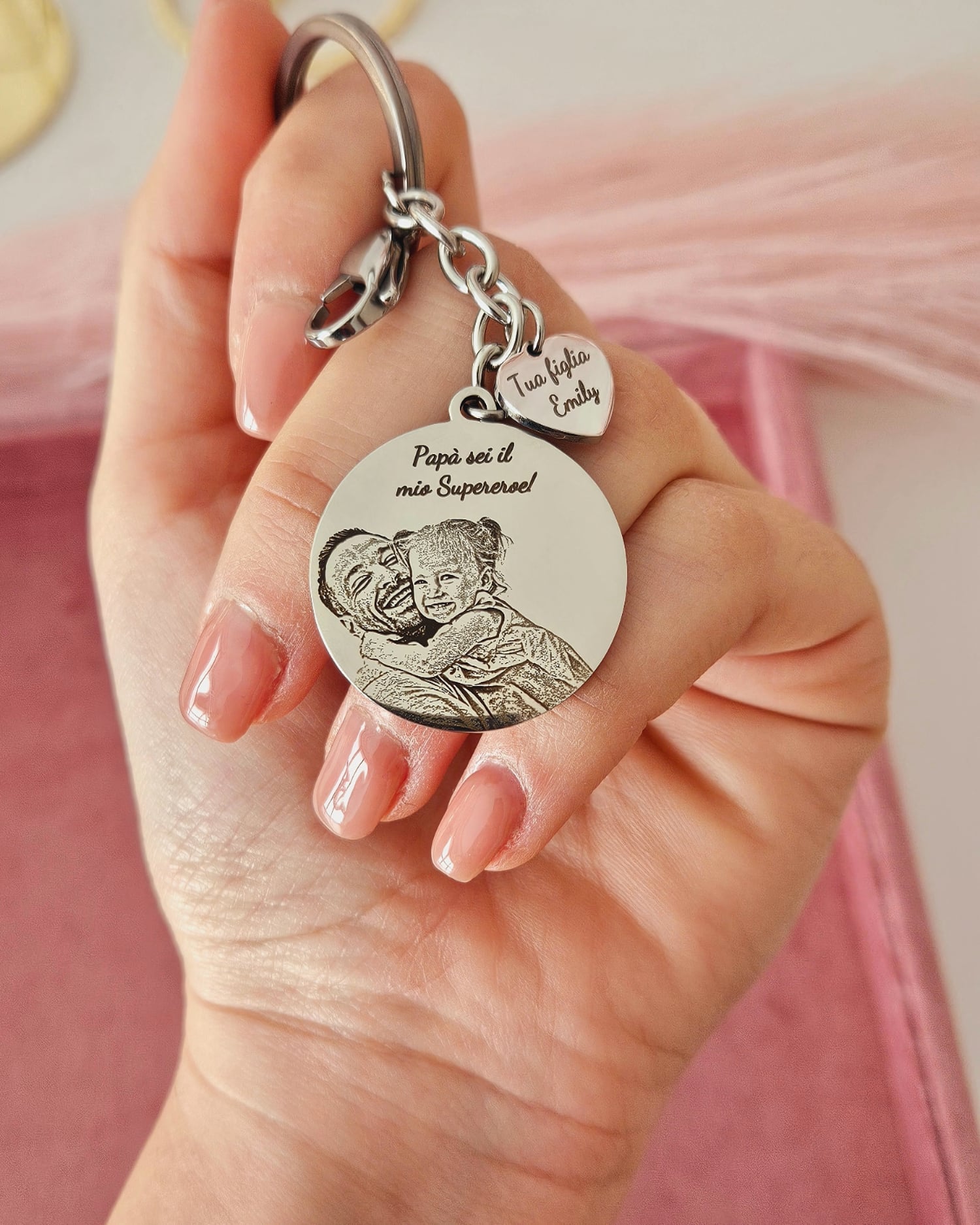 Questo portachiavi realizzato in acciaio inossidabile è un regalo perfetto per il tuo papà. Puoi personalizzarlo con una foto e una dedica da inserire sul davanti o sul retro della medaglietta. Con questo regalo, potrai sorprendere il tuo papà in modo unico e originale.
